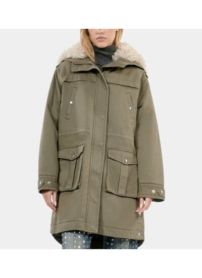 Cette parka femme The Kooples présente une coupe droite avec capuche non amovible doublée sherpa, manches longues, poignets ceinturés, poches raglan et plaquées à rabat, fermeture zippée avec boutons pression et doublure matelassée. Sa coupe large est recommandée pour un style décontracté et confortable.