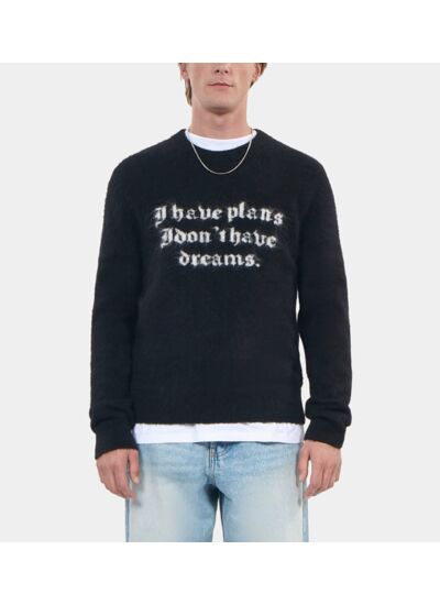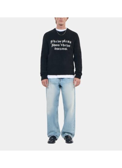 Pull homme The Kooples en alpaga noir, coupe large, col rond, manches longues, bords côtes. Jacquard "I Have Plans" contrasté. Si vous hésitez entre deux tailles, optez pour la taille en dessous.