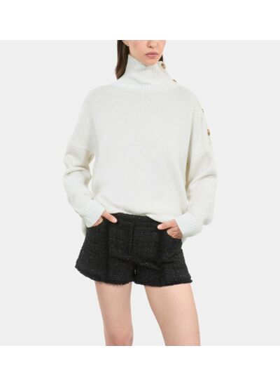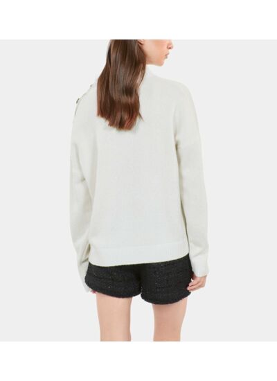 Laine, cachemire et fil métallisé composent ce modèle. Coupe large, col montant avec boutons héritage, manches longues. Conseil taille : si vous hésitez entre deux tailles, optez pour la plus petite.