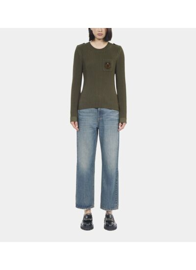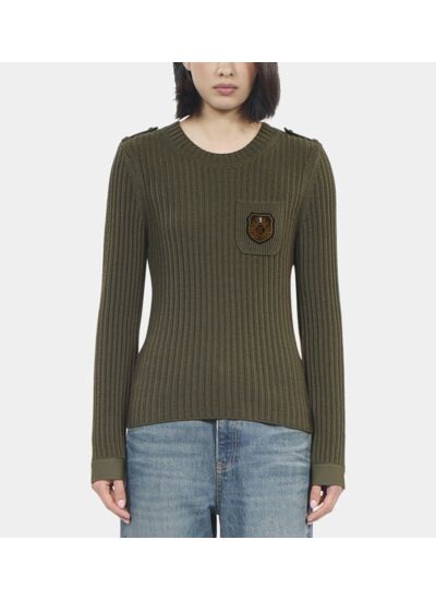 Fabriqué par The Kooples, ce modèle présente un col rond classique, des pattes d’épaule distinctives, des manches longues et une poche plaquée avec patch blason. Sa maille côtelée garantit une texture riche et une tenue impeccable.