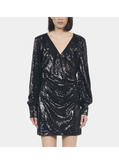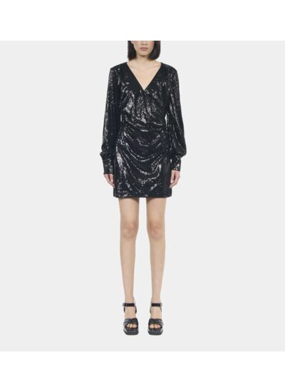 Robe courte entièrement recouverte de sequins noirs. Coupe ajustée avec encolure discrète. Manches longues pour un équilibre parfait entre audace et élégance. Marque : The Kooples.