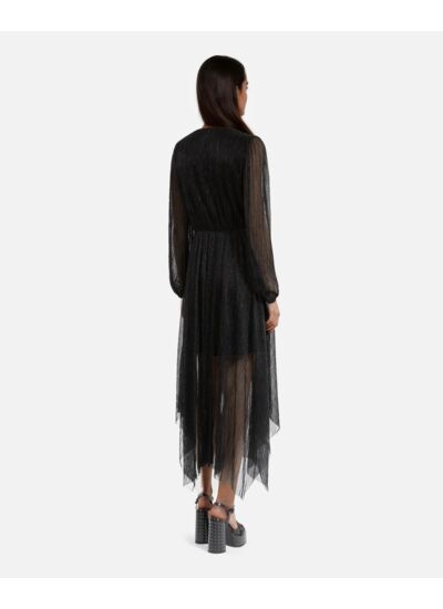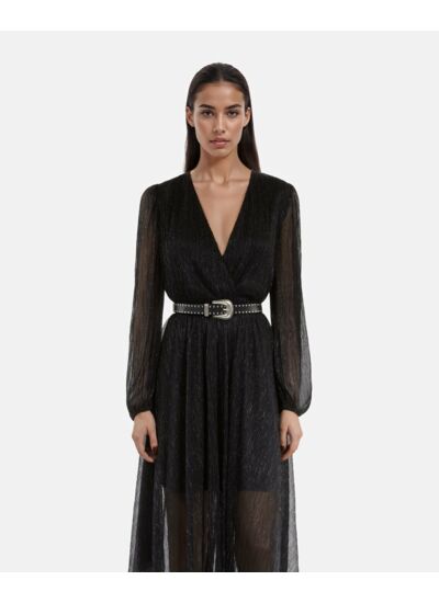 Robe femme The Kooples en fils métallisés argentés. Plissé soleil. Décolleté croisé en V. Manches longues. Taille élastiquée. Bas asymétrique. Longueur 137 cm (taille 36). Coupe ajustée.