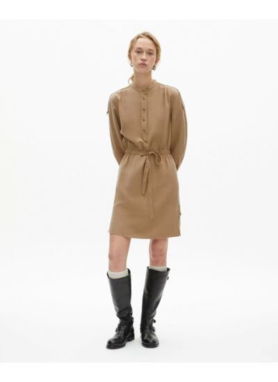 Conçue pour la femme contemporaine, cette robe se distingue par son col à patte de boutonnage et ses manches longues qui apportent une touche sophistiquée. La ceinture à coulisse intégrée souligne la taille avec finesse, tandis que les pattes d’épaules et les boutons héritage ajoutent un détail raffiné et unique. Sa longueur de 90,8 cm pour une taille 36 offre un équilibre parfait entre confort et allure.