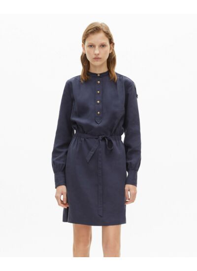 Conçue pour la femme contemporaine, cette robe se distingue par son col à patte de boutonnage et ses manches longues qui apportent une touche sophistiquée. La ceinture à coulisse intégrée souligne la taille avec finesse, tandis que les pattes d’épaules et les boutons héritage ajoutent un détail raffiné et unique. Sa longueur de 90,8 cm pour une taille 36 offre un équilibre parfait entre confort et allure.