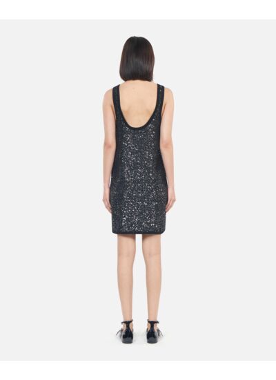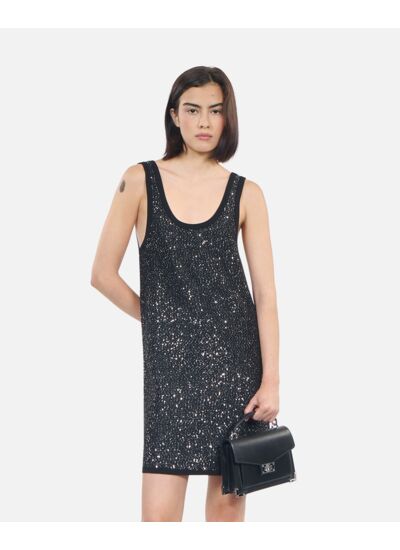 Conçue dans une maille délicate ornée de sequins brodés, cette robe droite épouse parfaitement le corps tout en offrant un confort optimal. Son décolleté rond, à la fois devant et au dos, apporte une touche de sensualité maîtrisée, tandis que l'absence de manches souligne la légèreté du modèle. Les bords côtes contrastés ajoutent une finition soignée et contemporaine, idéale pour un look affirmé.