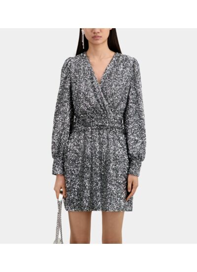 Conçue pour capturer la lumière à chaque mouvement, cette robe séduit par son décolleté cache-cœur et ses manches longues bouffantes qui apportent une touche de sophistication. La taille ajustée souligne vos courbes avec finesse, tandis que la longueur de 90 cm offre un équilibre parfait entre allure chic et confort. Les sequins brodés, minutieusement posés, garantissent un éclat durable et un style affirmé.