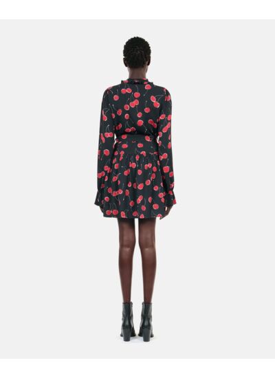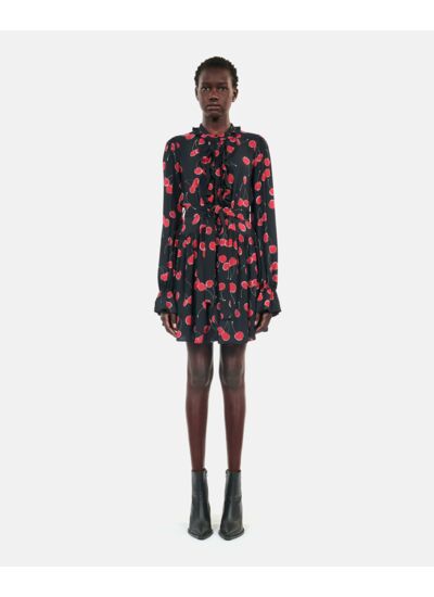 Marque : The Kooples. Robe femme avec imprimé cerises noir et rouge. Coupe ample, col rond, manches longues. Détails de volants. Robe doublée. Longueur : 90 cm pour une taille 36.