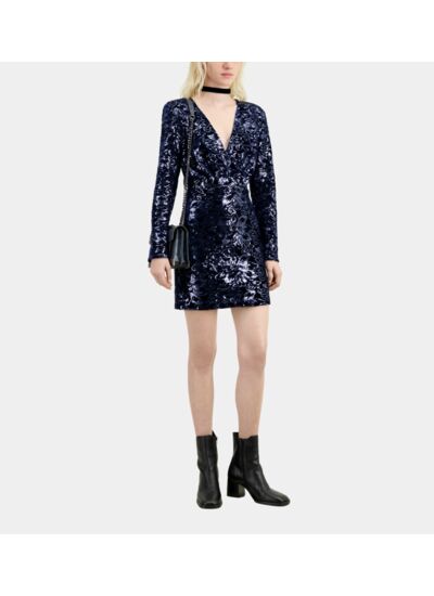 Robe courte bleu marine en velours avec sequins. Décolleté cache cœur. Manches longues. Fermeture par zip invisible. Motif fleuri brodé en sequins. Longueur 85 cm pour une taille 36. Marque : The Kooples.