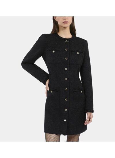 Conçue dans un tweed texturé, cette robe épouse la silhouette avec précision grâce à sa coupe courte et structurée. Le noir profond souligne la modernité du modèle, tandis que les détails subtils révèlent un savoir-faire raffiné. Facile à accessoiriser, elle devient la pièce maîtresse de votre garde-robe contemporaine.