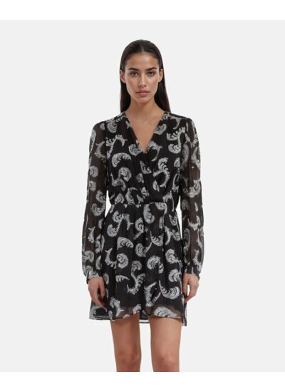 Robe femme The Kooples avec broderie plumes, décolleté cache-cœur, manches longues. Taille ajustée avec dos élastiqué, boutons aux poignets. Longueur 86 cm pour une taille 36. Coupe ajustée, prévoir une taille au-dessus en cas d’hésitation entre deux tailles.