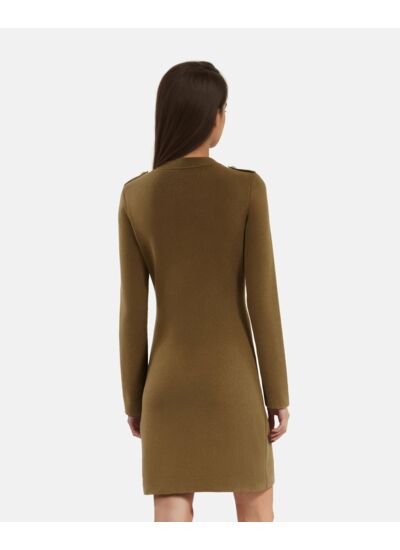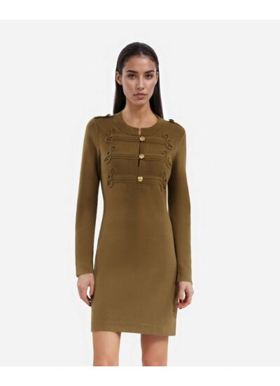 Conçue pour sublimer la silhouette, cette robe ajustée se distingue par son col officier et ses pattes d’épaule qui apportent une touche structurée et moderne. Les manches longues et le boutonnage devant, rehaussé de boutons héritage, renforcent son charme intemporel. Les détails brandebourgs ajoutent une signature unique, mêlant tradition et audace.