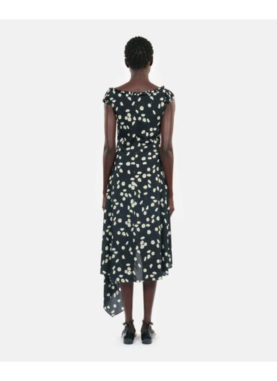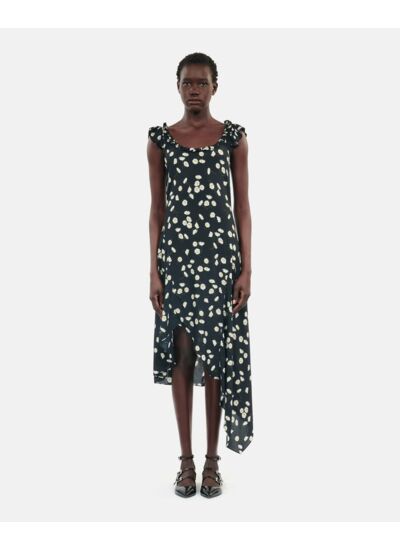 Robe femme The Kooples avec imprimé fleuri noir et blanc, col rond, bretelles larges, taille ajustée, détails de volants, bas asymétrique, fermeture par zip invisible, doublure intégrale, longueur 125 cm (taille 36).