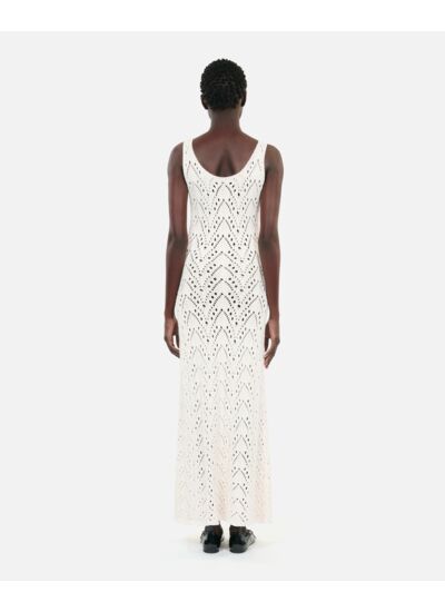 Conçue pour épouser vos formes avec finesse, cette robe dévoile une maille ajourée délicate qui apporte légèreté et texture à votre tenue. Les larges bretelles et le col rond soulignent harmonieusement le décolleté, tandis que la longueur de 123 cm pour une taille 36 assure une allure fluide et sophistiquée, idéale pour toutes les occasions.