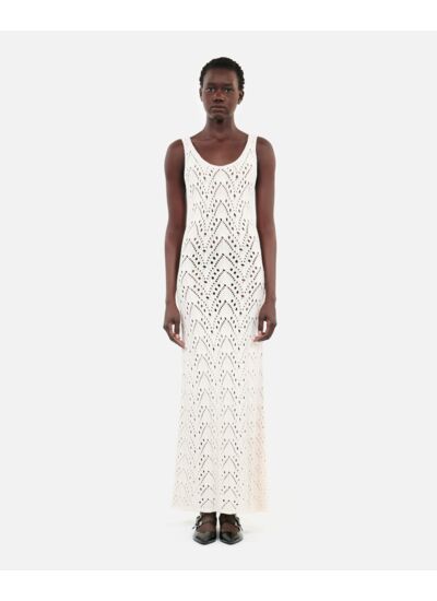 La robe longue écrue est réalisée en maille ajourée, ajustée avec des bretelles larges et un col rond. Sa longueur est de 123 cm pour une taille 36. Marque : The Kooples.