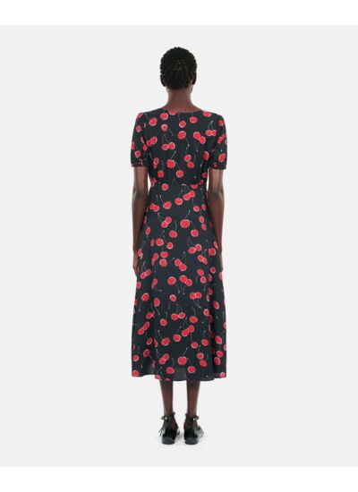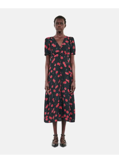 Marque : The Kooples. Imprimé cerises noir et rouge. Col V. Manches courtes. Taille empire ajustée. Boutons recouverts. Fente devant. Longueur 120 cm (taille 36).