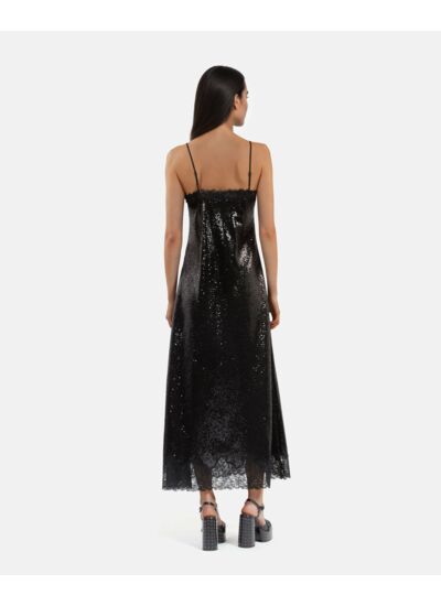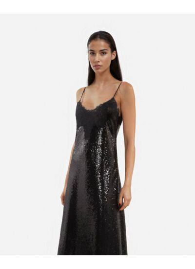 Robe femme The Kooples, sequins brodés, fines bretelles réglables, décolleté en V, détails en dentelle, zip invisible latéral, longueur 137 cm pour taille 36, coupe ajustée.