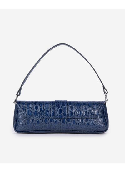 Dimensions : 13 x 38 x 6,5 cm. Matière : cuir embossé façon crocodile. Métallerie argentée. Anse amovible pour port épaule. Chaîne amovible. Fermoir signature Emily. Poche intérieure plaquée.