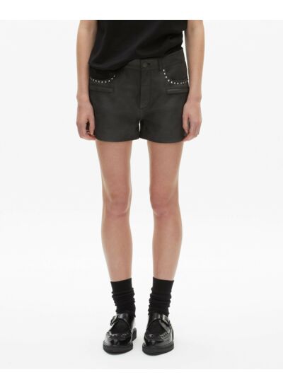 Short femme The Kooples en cuir lisse. Taille moyenne avec passants. Jambe large. Fermeture zippée. Poches cavalières et zippées devant. Poches passepoilées au dos. Détails de studs.