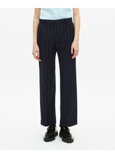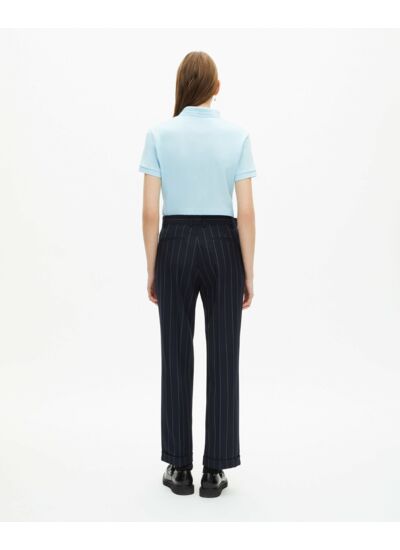 Pantalon femme en laine mélangée, taille moyenne avec passants, jambe droite à revers, plis devant. Poches latérales italiennes appliquées, poches dos plaquées. Fermeture zippée avec bouton de rappel et agrafe. Pour un look complet, combinez-le avec la veste FVES30008KNAV01.