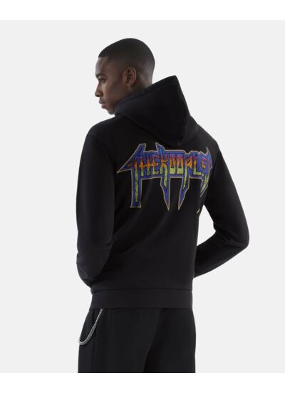 Marque : The Kooples. Matière : coton délavé. Coupe droite. Capuche avec cordon de serrage. Manches longues. Fermeture zippée. Poche kangourou. Bords côtes. Sérigraphie logo devant et dos.