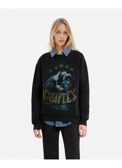 Fabriqué en coton délavé, il présente une coupe ample, un col rond classique, des manches longues et une sérigraphie panthère distinctive. Marque : The Kooples.