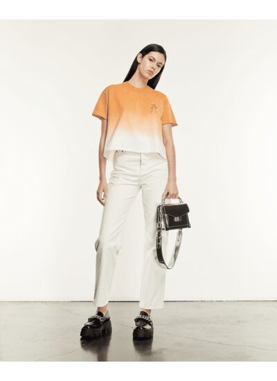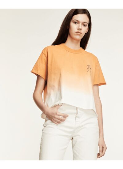 Confectionné par The Kooples, ce tee-shirt manches courtes tie & dye capte l’attention grâce à son jeu de couleurs dégradées et son dessin délicatement brodé sur la poitrine. Le dos se distingue par une inscription « kiss » imprimée, apportant une touche graphique et contemporaine. Sa coupe ajustée épouse la silhouette sans contraindre, offrant confort et liberté de mouvement.