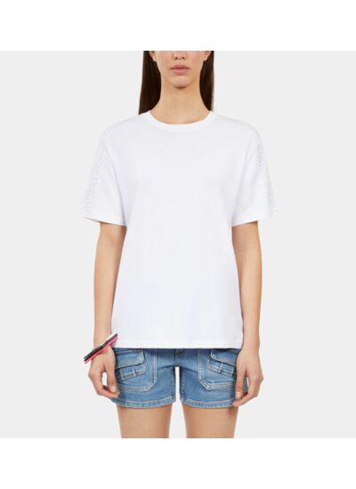 Conçu pour celles qui veulent se démarquer, ce t-shirt The Kooples joue sur le contraste entre le minimalisme du col rond et l’éclat des strass sur les épaules et manches. Les épaulettes amovibles apportent une touche modulable, vous permettant d’adapter votre look selon l’occasion, du casual chic au plus habillé.