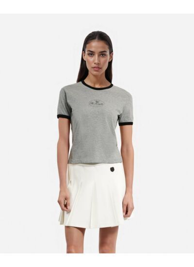 Confectionné dans un jersey doux et léger, ce T-shirt épouse parfaitement la silhouette grâce à sa coupe courte ajustée. La sérigraphie « The Kooples poem club » ajoute une signature graphique unique, tandis que le col rond et les manches courtes aux bords contrastés renforcent son caractère contemporain. Idéal pour un look casual chic, il se marie aisément avec un jean ou une jupe pour un style sans effort.