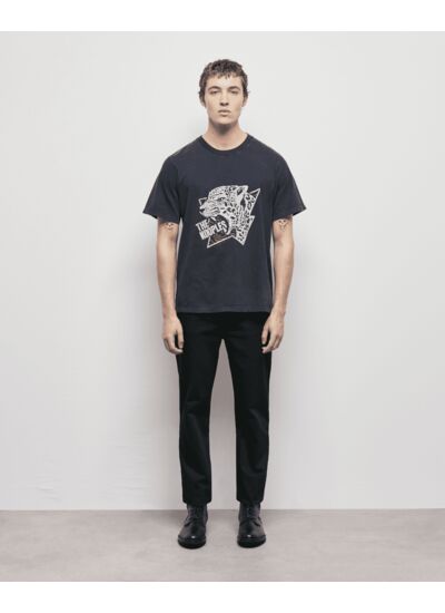 Confectionné en coton noir délavé, ce T-shirt offre une texture douce et un effet vintage qui évolue avec le temps. La sérigraphie tigre sur le devant apporte une touche sauvage et graphique, tandis que l’imprimé au dos complète subtilement l’esthétique. Sa coupe droite avec col rond et manches courtes assure un confort optimal et une silhouette équilibrée.