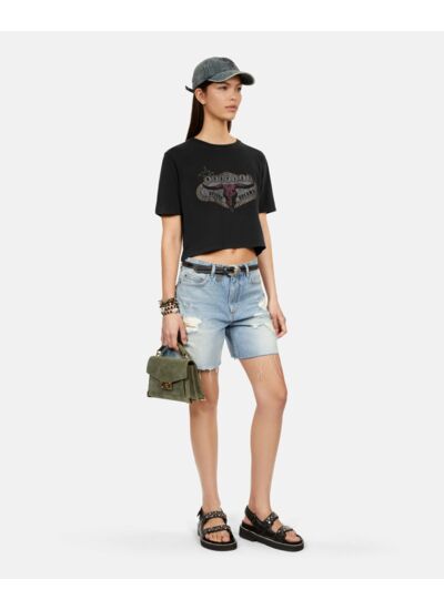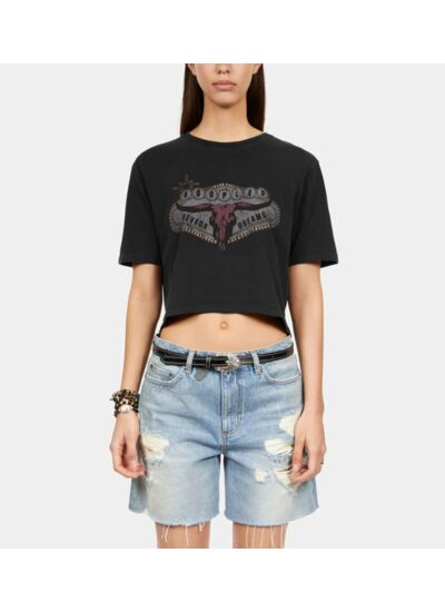 Confectionné en coton lavé, ce T-shirt offre une texture douce et un confort durable, idéal pour un port quotidien. Son col rond classique et ses manches courtes assurent une silhouette épurée, tandis que la sérigraphie strassée apporte une touche de caractère et de lumière à votre look.