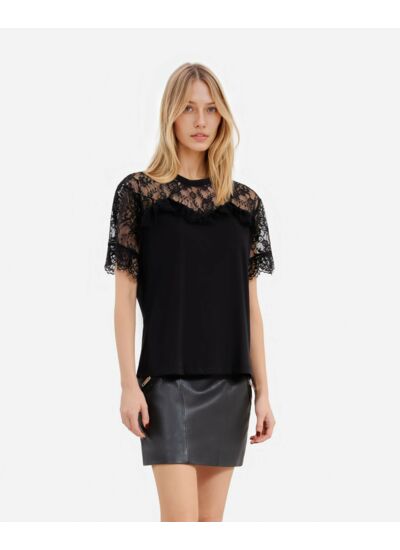 Conçu pour les femmes qui recherchent une allure à la fois chic et décontractée, ce tee-shirt associe un jersey doux à un empiècement en dentelle raffinée sur le haut. Son col rond et ses manches courtes offrent un confort optimal tout en mettant en valeur la féminité grâce à la transparence subtile de la dentelle. Facile à porter, il se marie aussi bien avec un jean qu’une jupe pour un look versatile.