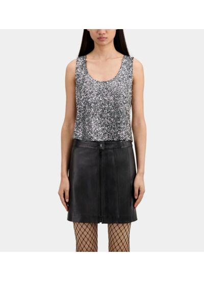Top court, col rond, sans manches, sequins brodés. Marque : The Kooples.