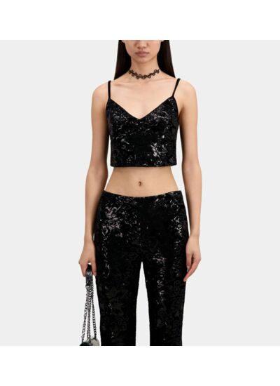 Sublimez votre allure avec ce top court noir en velours orné de sequins, une pièce qui allie élégance et audace. Sa coupe ajustée et ses détails raffinés captivent le regard dès le premier instant.