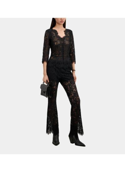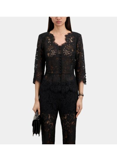 Confectionné dans une dentelle délicate, ce top épouse la silhouette tout en offrant une touche de sensualité maîtrisée. Le boutonnage devant et les manches longues aux poignets boutonnés apportent une finition soignée, tandis que les bords festonnés soulignent son caractère sophistiqué et féminin. Parfait pour une soirée ou un look chic au quotidien, il se marie aisément avec un pantalon tailleur ou une jupe crayon.