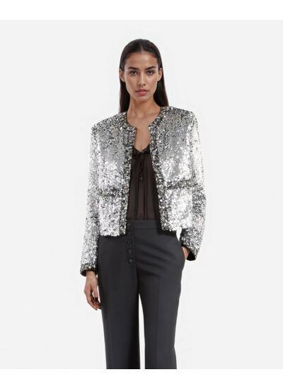 Brillez avec élégance grâce à cette veste à sequins et perles argentée signée The Kooples. Une pièce unique qui transforme instantanément votre silhouette en un véritable statement mode.