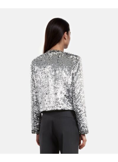 Réponse : Cette information n’est pas spécifiée, mais la veste est ornée de sequins et perles argentés brodés.