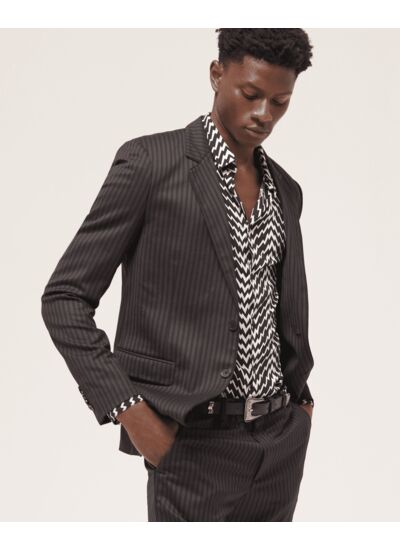 Confectionnée en laine noire et grise à fines rayures, cette veste séduit par son col cranté et sa coupe ajustée. Les manches longues et les deux poches à rabat soulignent son style classique, tandis que la fermeture à deux boutons apporte une touche de raffinement discrète. Parfaite pour le bureau comme pour les occasions formelles, elle s’adapte à toutes vos envies de sophistication.