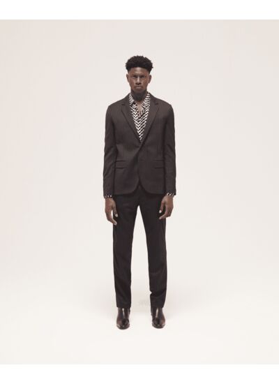 La veste costume The Kooples est réalisée en laine de grammage 176 g/m², avec un col cranté, deux poches à rabat, manches longues et une fermeture à deux boutons. Les rayures fines apportent une touche subtile de caractère.