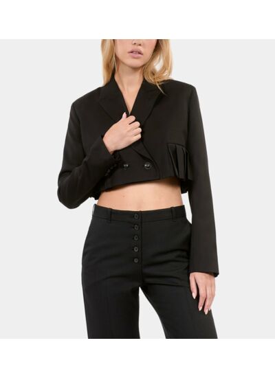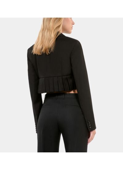 Conçue pour sublimer la silhouette féminine, cette veste joue sur le contraste entre la douceur de la laine mélangée et la texture graphique des plis. Facile à associer, elle se porte aussi bien en journée qu’en soirée, offrant un look à la fois sophistiqué et contemporain. Son coloris noir profond garantit une polyvalence maximale dans votre garde-robe.