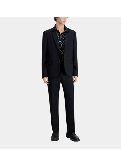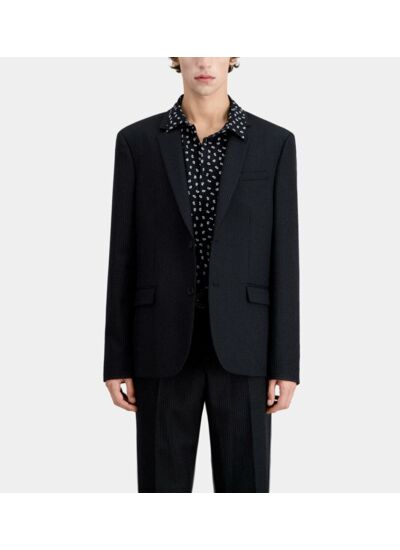 Coupe droite, col cranté, manches longues, fermeture à deux boutons, boutons aux poignets, poche passepoilée à la poitrine, poches passepoilées à rabat devant, tissu italien.