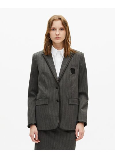 Conçue en laine mélangée, cette veste épouse délicatement la taille grâce à sa coupe légèrement cintrée. Son col cranté et ses manches longues soulignent un design classique revisité, tandis que les détails en cuir et les boutons héritage apportent une touche sophistiquée et authentique. Le patch blason à la poitrine affirme l’identité de la marque avec subtilité.