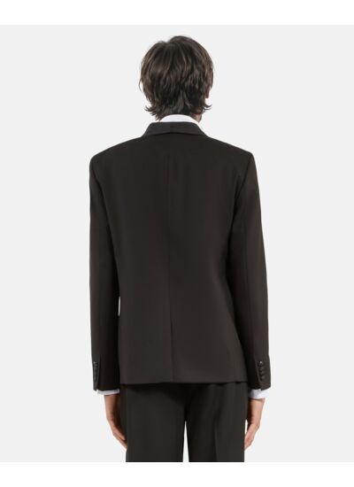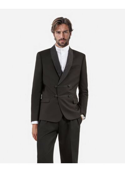 Confectionnée en laine italienne de qualité, cette veste associe confort et style. La fermeture croisée et les brandebourgs apportent une touche d’originalité maîtrisée, tandis que les poches passepoilées et à rabat renforcent son caractère fonctionnel. Le col châle souligne l’élégance du vêtement, idéal pour vos soirées habillées ou événements formels.