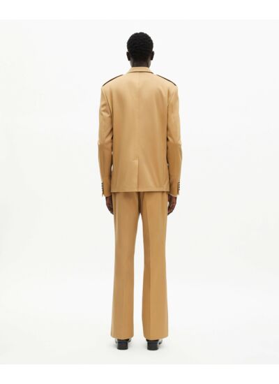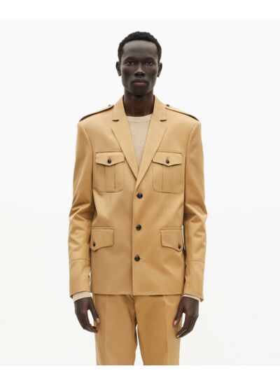Réponse. Les pattes d’épaule, le col cranté et les poches poitrine à pli plat soulignent son style militaire.