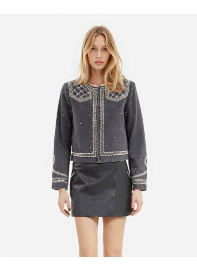 Cette veste vous offre une allure unique sans sacrifier votre confort. Sa coupe droite flatte toutes les morphologies et les détails en studs et perles ajoutent une dimension sophistiquée à votre tenue. Facile à associer, elle devient rapidement un incontournable de votre garde-robe.