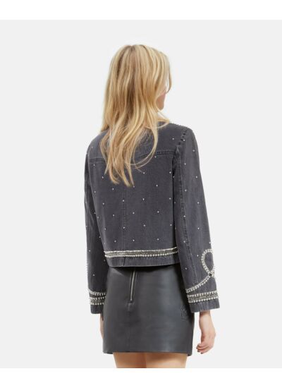 Affirmez votre style avec cette veste en denim ornée de studs et perles, une pièce audacieuse signée The Kooples. Sa teinte grise subtile et son design épuré s’adaptent à toutes vos envies mode.