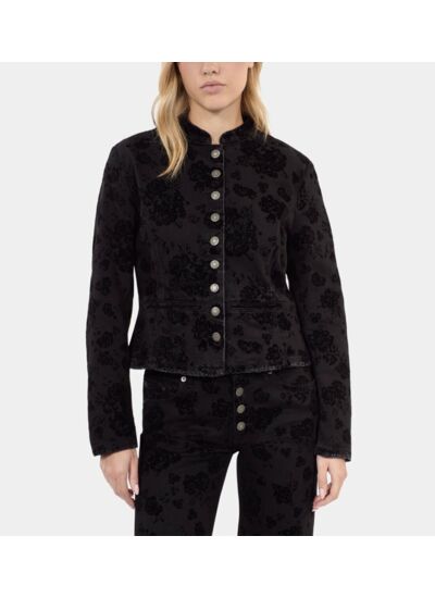 Réponse. La veste est en denim noir, un tissu robuste et durable.