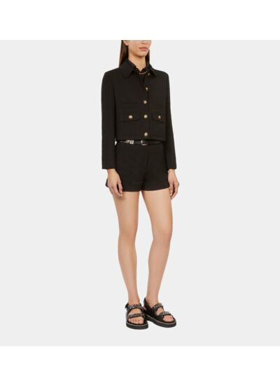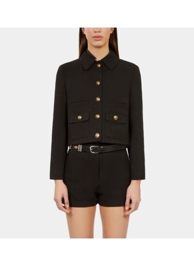 Conçue pour sublimer toutes les silhouettes, cette veste adopte une coupe droite qui assure un tombé impeccable. Son col classique et ses manches longues apportent une touche de sobriété tandis que les boutons dorés aux poignets et sur les poches ajoutent un détail raffiné et distinctif. Polyvalente, elle se porte aussi bien en journée qu’en soirée, avec un jean ou une jupe, pour un look toujours maîtrisé.