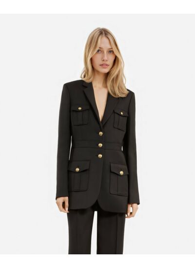 Conçue pour la femme contemporaine, cette veste droite séduit par son col cranté et ses manches longues finies par des boutons aux poignets. La fermeture à trois boutons et les quatre poches plaquées à rabat apportent une touche utilitaire chic, tandis que les boutons héritage soulignent son caractère unique. Sa coupe ajustée valorise la silhouette, offrant un équilibre parfait entre confort et allure.