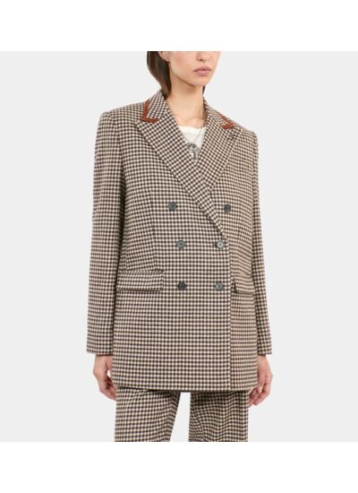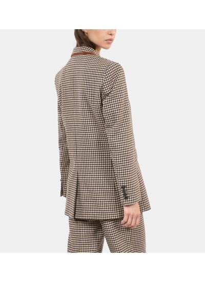 Confectionnée avec un tissu à carreaux Vichy, elle présente une coupe cintrée, un col tailleur classique, des poches latérales discrètes et une fermeture boutonnée. La doublure intérieure garantit un tombé impeccable et un confort durable.
