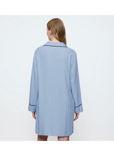 Designed for effortless comfort, this boyfriend-inspired nightdress is an invitation to unwind in style. A classic collar, button-down closure, and refined piping create a polished silhouette, while soft, fluid 100% certified Lenzing EcoVero viscose drapes effortlessly. The subtle striped shiny-and-matt Jacquard adds just a hint of luxe sheen.
